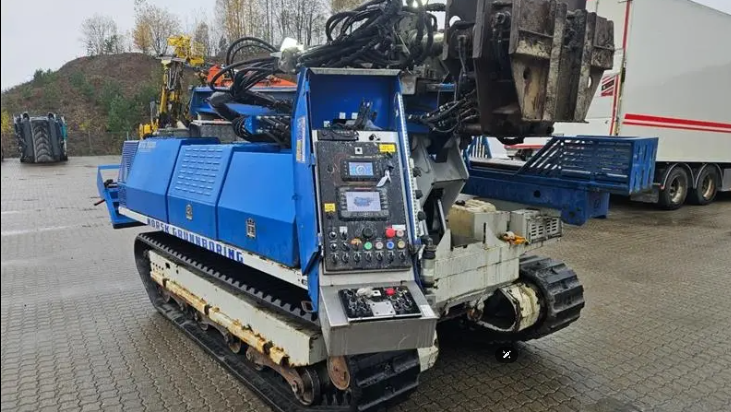 The machine starts and works with remote control. The right belt motor is difficult to get and “react” in reverse – must be overhauled / replaced. The machine alerts for service. Various drill rods included.